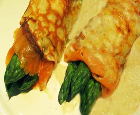 Crêpes fines aux asperges et au saumon fumé, sauce au vin blanc